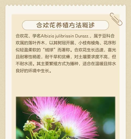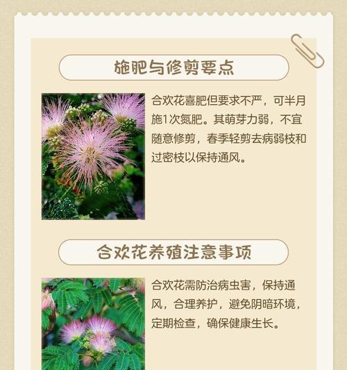 夜合花,又称美人蕉,是一种极具观赏价值的花卉植物。它具有迷人的花朵和香气,被广泛用于庭院和花坛的装饰。然而,要成功地养殖夜合花并让它健康茂盛地生长并开花,需要一些专门的技巧和方法。本文将详细介绍以夜合花的养殖方法,帮助您打造美丽花园。
